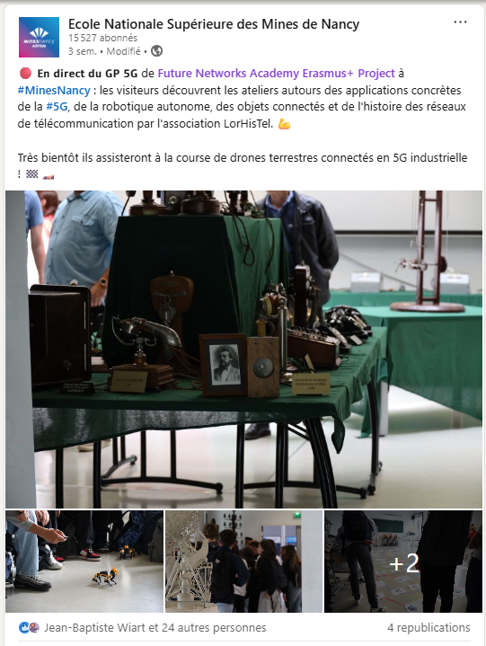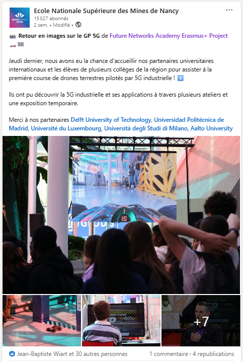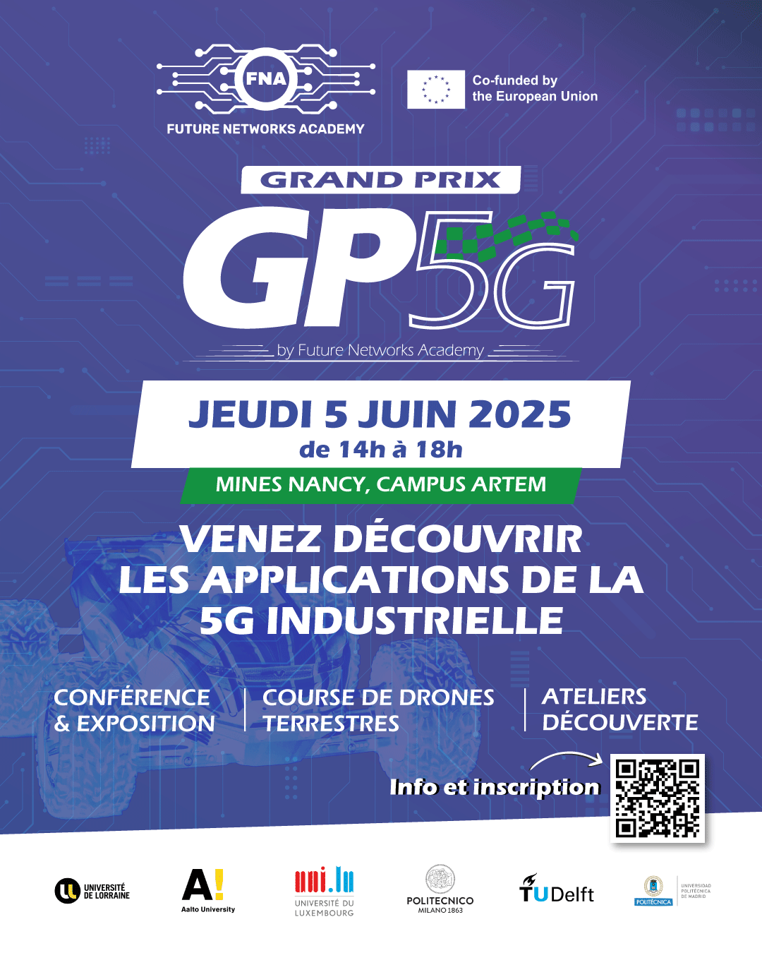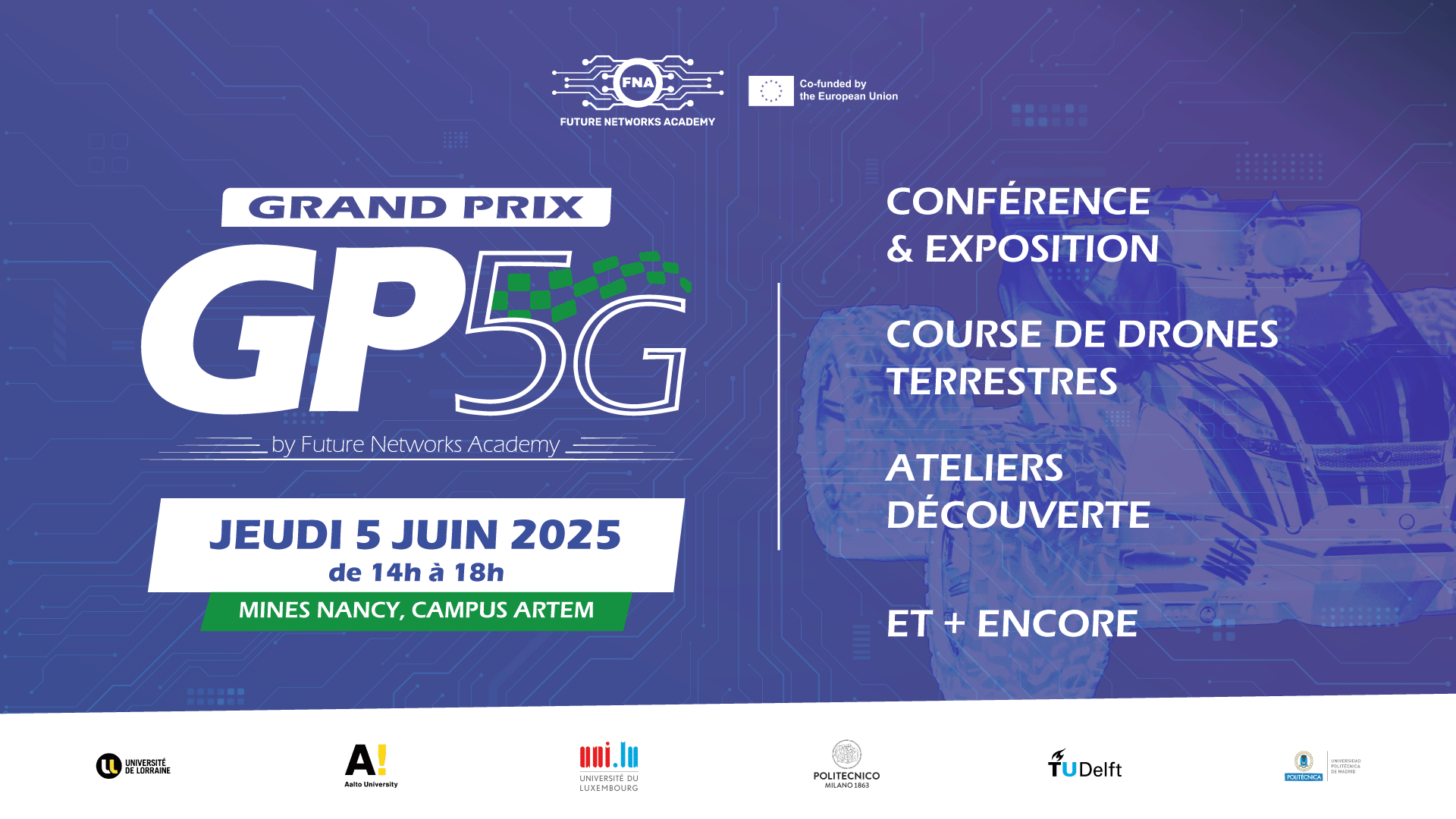 Le Grand Prix 5G est un événement qui a eu lieu le 5 juin 2025 à Mines Nancy dans le cadre du projet européen Future Networks Academy (FNA), soutenu par le programme Erasmus+. En collaboration avec six universités partenaires : Université de Lorraine, Aalto University (Finlande), Université du Luxembourg, Politecnico di Milano (Italie), TU Delft (Pays-Bas) et Universidad Politécnica de Madrid (Espagne). L’objectif de l’événement était de rendre accessibles les enjeux techniques et sociétaux liés à la 5G et aux réseaux du futur.