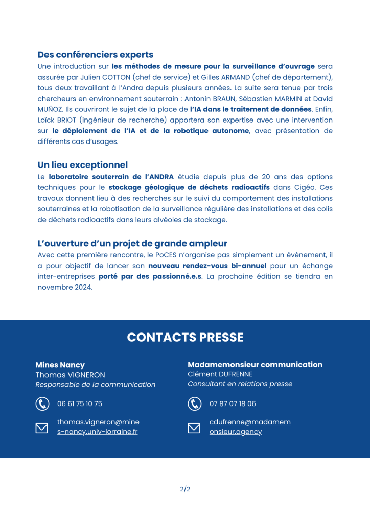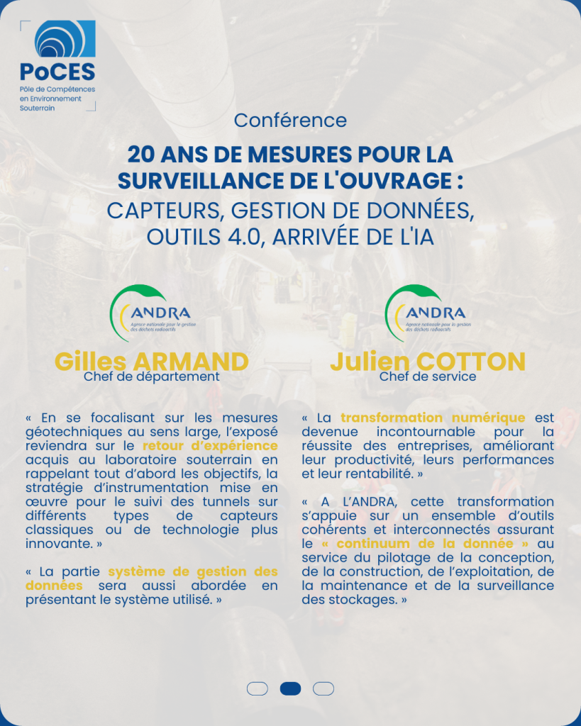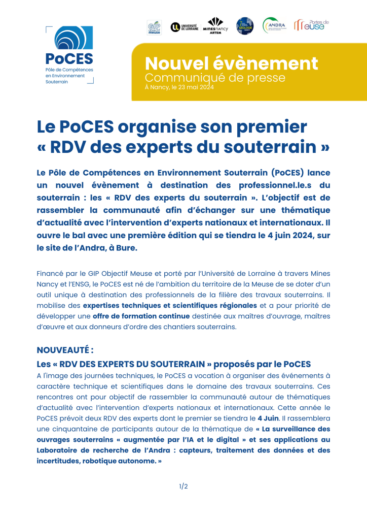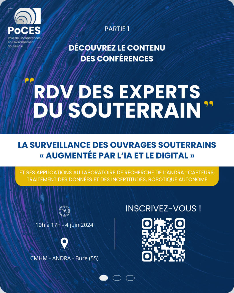 Le RDV des experts du souterrain, organisé par le Pôle de Compétences en Environnement Souterrain (PoCES), s’est tenu pour sa première édition mardi 4 juin 2024 en partenariat avec l’Andra. L’événement était axé sur « La surveillance des ouvrages souterrains augmentée par l’IA et le digital », avec des conférences d’experts, buffet-déjeuner et visites du laboratoire souterrain de l’Andra incluant un tour du futur site Cigéo.
